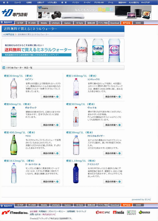 フード、ファッション、インテリア雑貨――デジモノ以外も+Dにお任せ! 「+D 専門店街」オープンアイティメディアは、EC関連サービス「ITmedia +D 専門店街」を開始した。取り扱う商品のカテゴリは、「健康・癒し・ダイエット」「フード・ドリンク」「生活・インテリア・雑貨」などの11種類で、サイト開設時は合計1200万点以上の商品を用意する。![]() サイト開設時の特集は「送料無料で買えるミネラルウォーター」「ニッセンオンラインお買い物情報」の2本立て << 記事に戻る | << 前の画像 | 次の画像 >> |