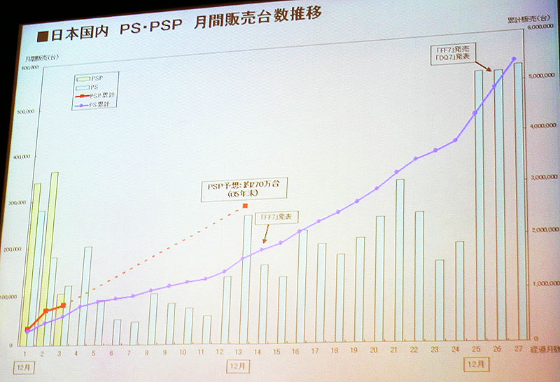 「ゲーム市場、実は成長している」 次世代機も予測する浜村社長浜村氏によると、オンラインゲームを合算すれば、ゲーム市場は成長を続けているという。話題はドラクエのネットワーク化や、坂口博信氏が開発中の次世代Xbox向けゲームなどさまざま。![]() PSPとDSの販売台数予想を、PlayStationの売れ行きに重ねたグラフ。「PSPの売れ行きはPSに似ている。PSPは今年末に250〜300万台出るだろう。DSの売り上げはソフトに引っ張られる。『ポケモン』シリーズが年末までに出れば、500万や600万売れるかもしれない」 << 記事に戻る | << 前の画像 | 次の画像 >> |